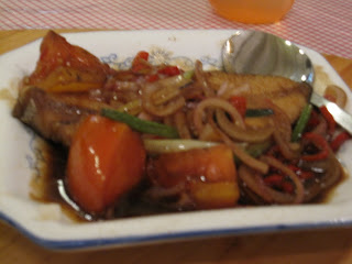 All dishes were served family style with a large lazy Susan in the middle. One dish was fried bee hoon. This noodle dish came with a lot of fixings, including seafood, scallions, and bean sprouts. It served to sate our appetites.
